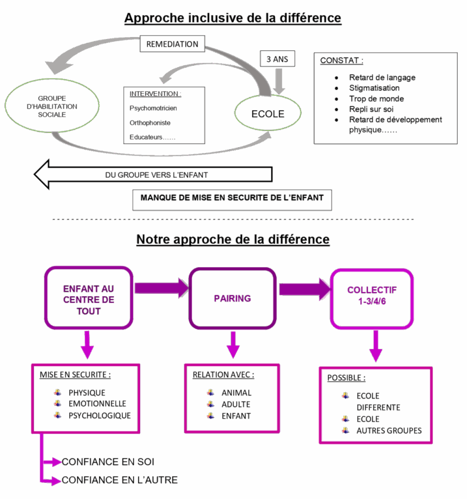 À l’école (vers 3 ans), on repère des difficultés et l’on met en place une remédiation (bilans, séances) avec des intervenants : psychomotricien, orthophoniste, éducateurs… L’enfant est renvoyé vers un groupe d’habilitation sociale.